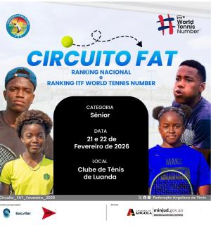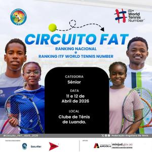 ACTUALIZAÇÃO❗️CIRCUITO FAT SÉNIOR – FEVEREIRO 2026A Federação Angolana de Ténis, no âmbito do cumprimento do seu calendário oficial, tem agendado para os dias 21 e 22 de Fevereiro de 2026, a realização do Circuito FAT na…