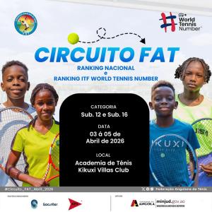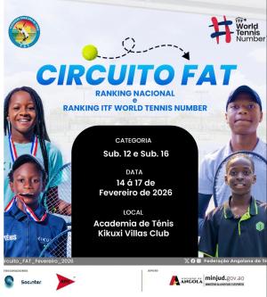 ❗️ACTUALIZAÇÃO❗️CIRCUITO FAT SUB-12 & SUB-16 – FEVEREIRO 2026A Federação Angolana de Ténis, no âmbito do cumprimento do seu calendário oficial, tem agendado de 14 a 17 de Fevereiro de 2026, a realização do Circuito FAT…