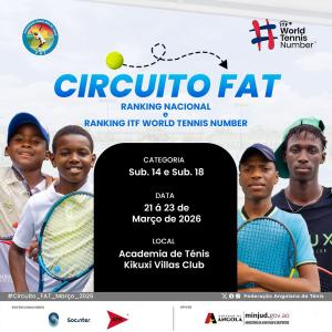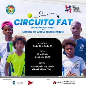 A Federação Angolana de Ténis, no âmbito do cumprimento do seu calendário oficial de competições, tem agendado para os dias 18 e 19 de Abril de 2026 a realização do Circuito FAT nas categorias Sub-14 e Sub-18 (Masculino…