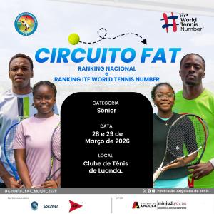 A Federação Angolana de Ténis, no âmbito do cumprimento do seu calendário oficial de competições, tem agendada, para os dias 28 e 29 de Março de 2026, a realização do Circuito FAT na categoria Sénior (Masculino e Feminino),…