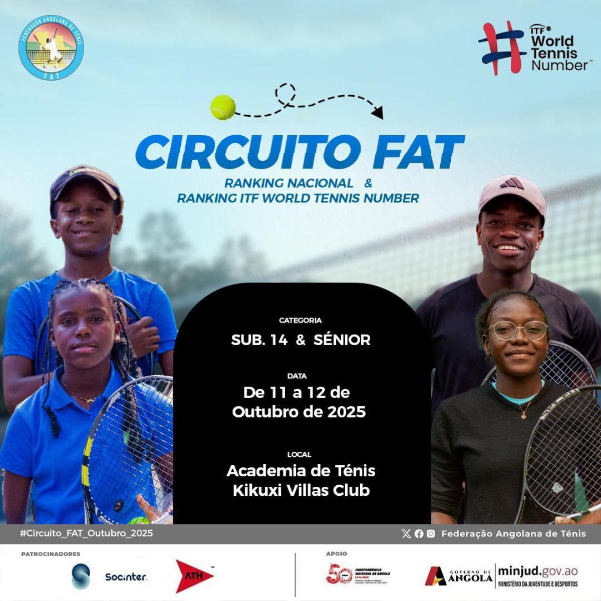 A Federação Angolana de Ténis, no âmbito do cumprimento do seu calendário oficial, informa que nos dias 11 e 12 de Outubro de 2025 terá lugar, em Luanda, o Circuito FAT nas categorias Sub-14 e Sénior (Masculino/Feminino).