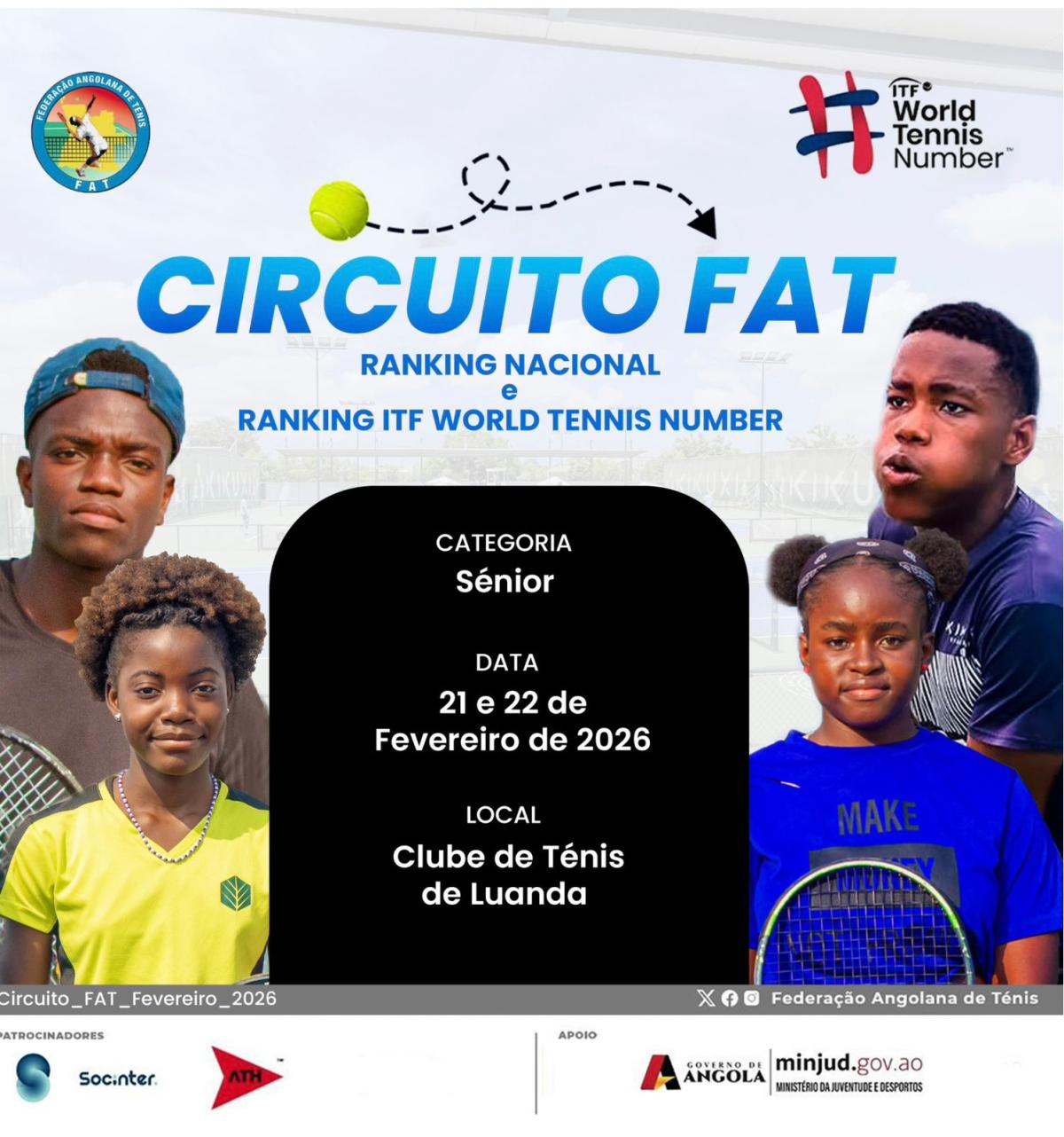 A Federação Angolana de Ténis, no âmbito do cumprimento do seu calendário oficial, tem agendado para os dias 21 e 22 de Fevereiro de 2026, a realização do Circuito FAT na categoria Sénior (Masculino/Feminino) em Luanda nas instalações do Clube de Ténis de Luanda.