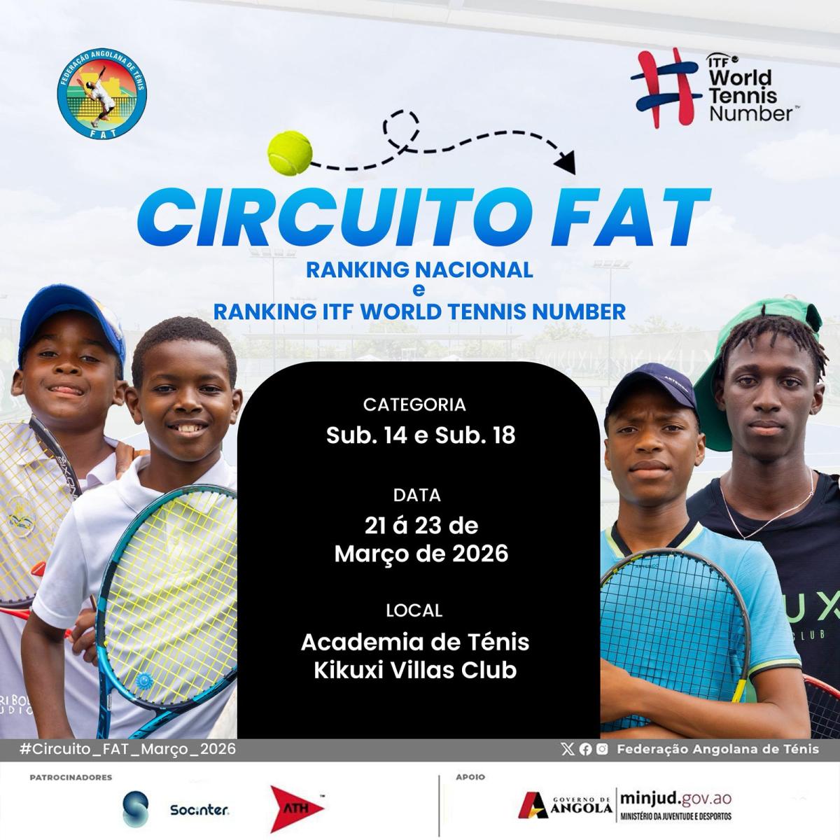 A Federação Angolana de Ténis, no âmbito do cumprimento do seu calendário oficial de competições, tem agendada, de 21 a 23 de Março de 2026, a realização do Circuito FAT, nas categorias Sub-14 e Sub-18 (Masculino e Feminino), em Luanda, nas instalações da Academia de Ténis Kikuxi Villas Club.